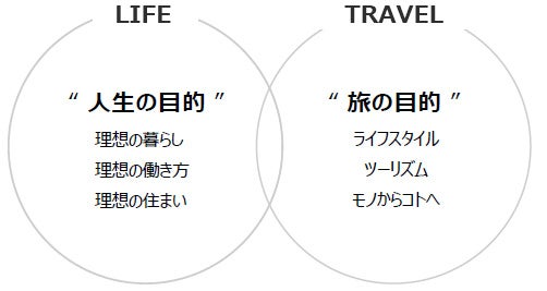 旅行や観光を単なる非日常の活動と捉えるのではなく、暮らしや人生と密接に結びつけて捉えることで、「旅、暮らし、人生の目的地」をデザインし、社会に提案します。これにより、旅行や観光を通じて個々人の理想の暮らしや人生の実現をサポートすることを目指します。