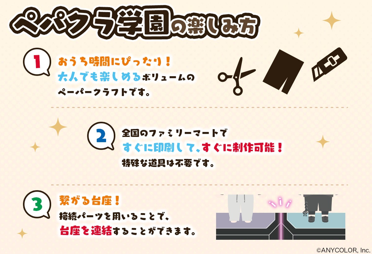 「ペパクラ学園」は細部にまでこだわり、キャラクターたちの可愛さを存分に引き出した高クオリティのペーパークラフトシリーズです。お近くの「ファミリーマート」でプリントし、ご自宅にある道具を使って作成できます。