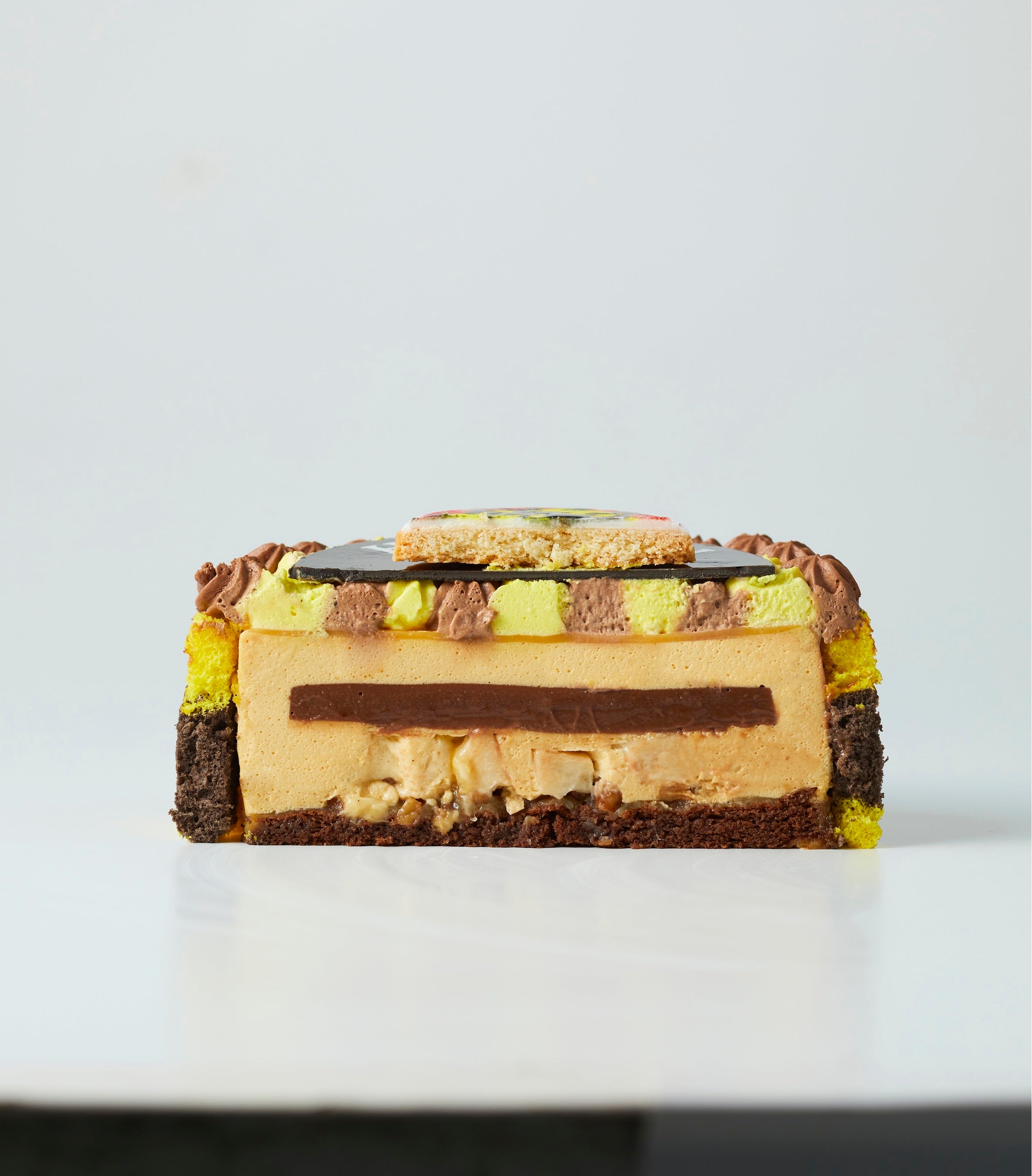 北海道産生クリームをたっぷり使用したキャラメルムースの中にバナナソースを入れてバナナとクルミをトッピング。さらに周りにはトラ柄のスポンジを巻いています。ベルギー産チョコレートをトップに絞り、おいしく華やかに仕上げました。
