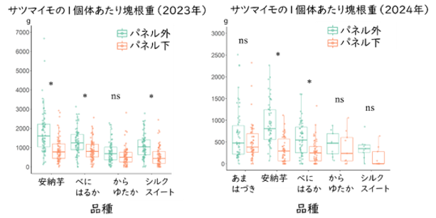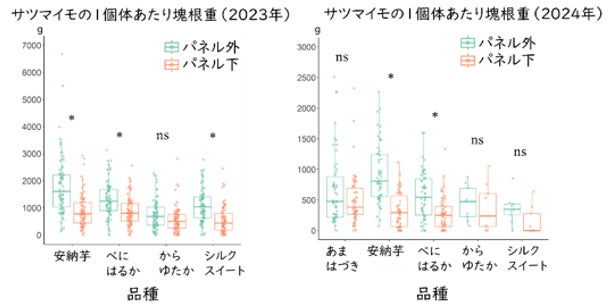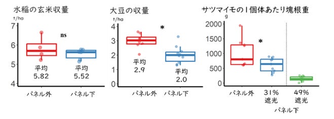 そこで研究グループは、千葉県の複数の農業法人の協力のもと、2024年に水稲(もち米)や大豆、サツマイモを対象に太陽光パネル下とパネル外での生育の違いを調べ、気象データも測定しました。さらに、2023年と2024年に有機栽培サツマイモを対象に、品種、除草のタイミング、有機肥料の有無を変えて調査を行いました。