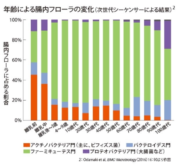 大腸内のビフィズス菌は加齢とともに減少します(主に、離乳後と60歳代以降)。一方、大腸菌などが属するプロテオバクテリア門の細菌は60歳代以降に増加し、加齢とともに腸内フローラのバランスが崩れやすいことが報告されています。