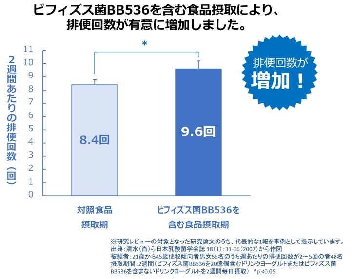 対照食品の摂取期間と比較して、ビフィズス菌BB536を含む試験食品の摂取により、2週間の排便回数が有意に増加した。