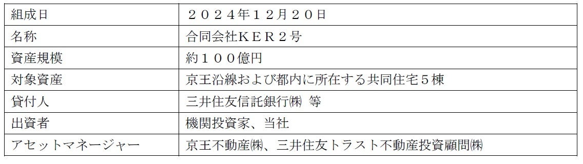 京王電鉄株式会社(本社:東京都多摩市、代表取締役社長:都村 智史、以下「京王電鉄」)は、 中期経営計画に掲げる「稼ぐ力の強化」および「大規模投資期のキャッシュアウトに耐えうる財務基盤づくり」に向けて、京王不動産株式会社(本社:東京都渋谷区、代表取締役社長:金子 伸雄、以下「京王不動産」)とともにアセットマネジメント事業を推進しております。この度、京王不動産がアセットマネージャーを務める第2号不動産私募ファンドを組成し、運用を開始しましたので お知らせします。