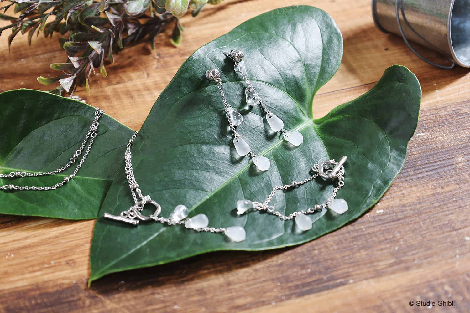 今回の新作は「となりのトトロ」より、お庭で遊んでいるメイちゃんの前に小トトロが現れるシーンをイメージして、とうめいな姿から徐々に実体に変わっていく様子の小トトロをモチーフに、可愛らしく日常使いしやすいアクセサリーに仕上げました。ラインナップは、ピアス、イヤリング、ネックレス、ブレスレットの全4種類。ネックレスとブレスレットは、もりのぽんぽねシリーズで初めて、金具を丸い輪に入れてとめるマンテルの留め具を採用しました。また、小トトロのパーツ部分には、クリア、マットクリア、乳白の3色のパーツを使用することで、作中でとうめいな状態から徐々に姿が見え始める様子を表現しています。まるで雨のしずくのようにも見える、「となりのトトロ とうめい小トトロシリーズ」を身に着けて、これからやってくる梅雨や夏の時期のお出かけをお楽しみください。