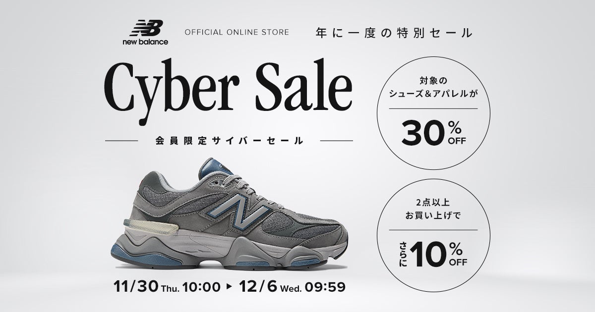 ニューバランス公式オンラインストアでは、日ごろの感謝をこめて11月30日(木)AM 10:00から12月6日(水)AM 9:59までの期間限定で1年に1度の特別なセール「Cyber Sale」をmyNB会員様限定にて開催いたします。