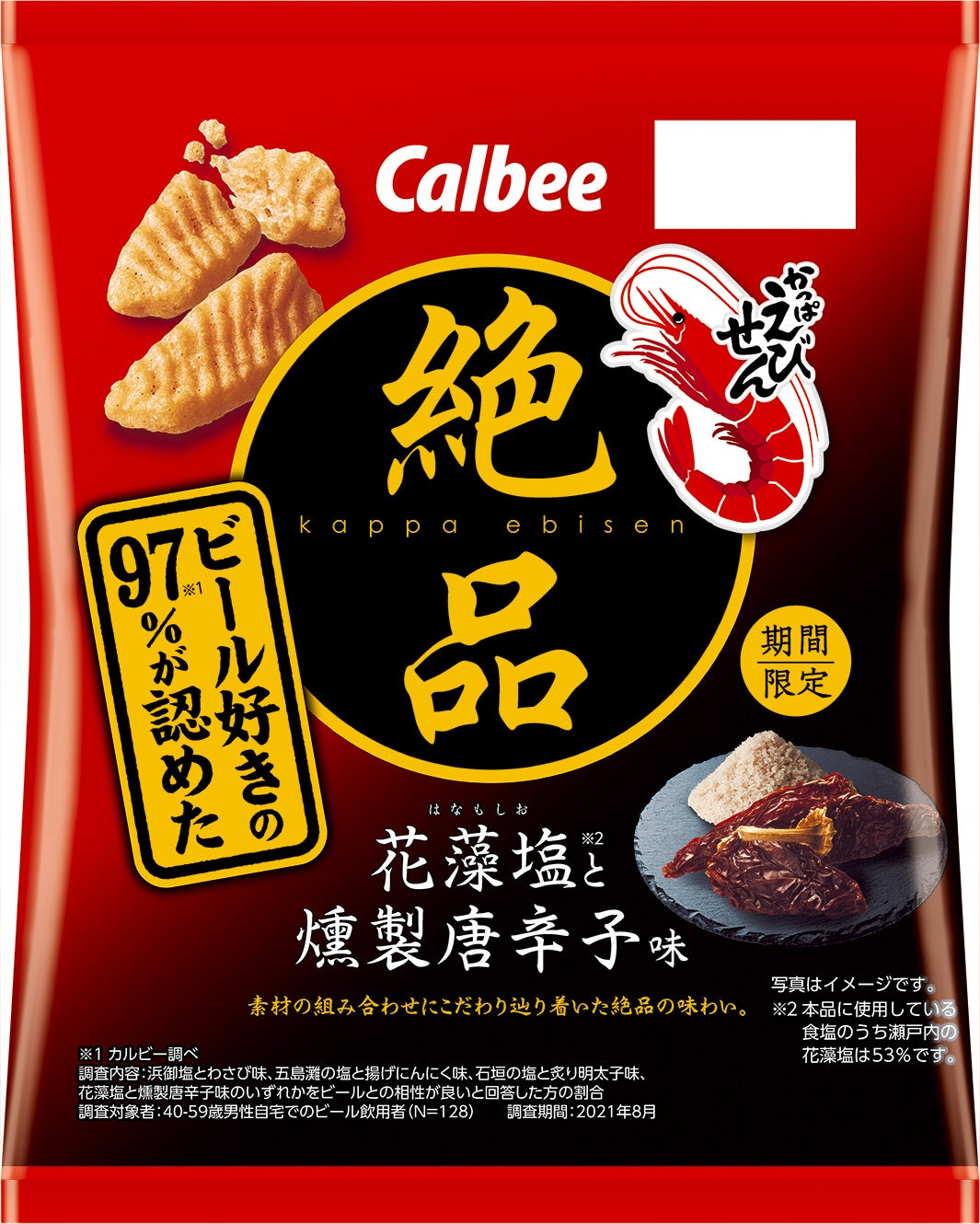 ビール好きの97%が認めた※1お酒に合う「かっぱえびせん」の人気シリーズ素材の絶妙な組み合わせで、辿り着いた絶品の味わい『絶品かっぱえびせん 花藻塩と燻製唐辛子味』
