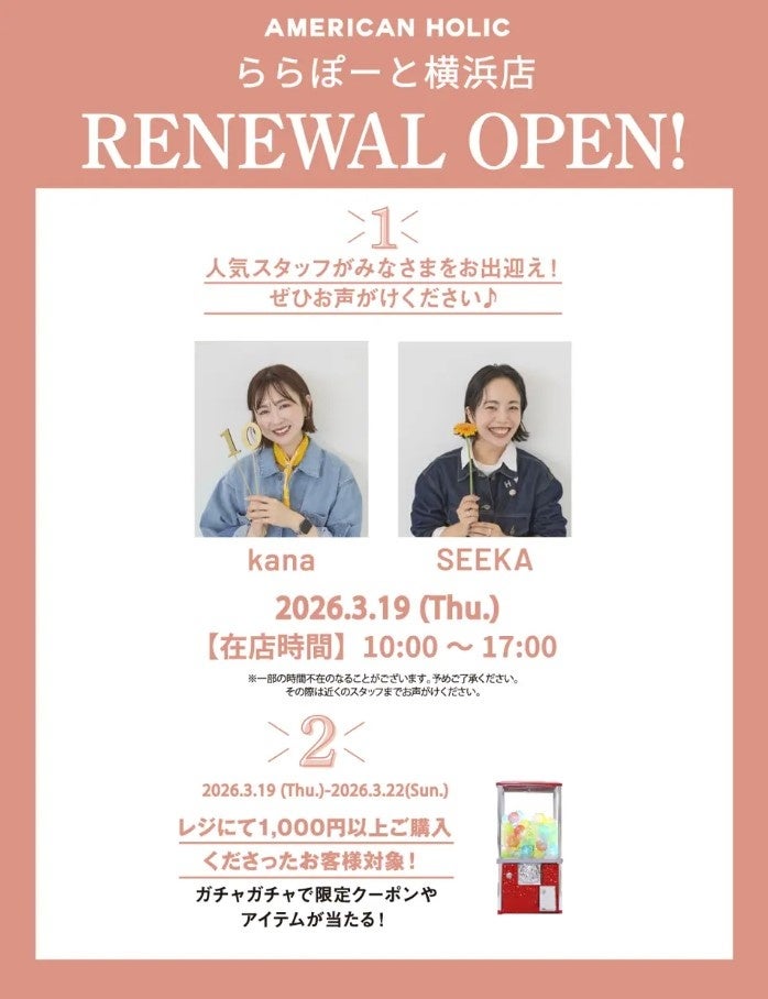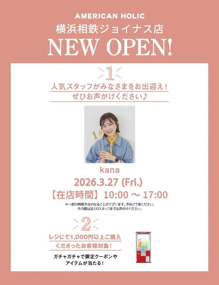 株式会社ストライプインターナショナル(本社:岡山県岡山市、代表取締役社長:川部将士)が展開するブランド「AMERICAN HOLIC(アメリカンホリック)」は、2026年3月に横浜エリアにて2店舗を新たにオープンいたします。3月19日(木)には「ららぽーと横浜店」がリニューアルオープン、3月27日(金)には「相鉄ジョイナス店」がグランドオープンいたします。
