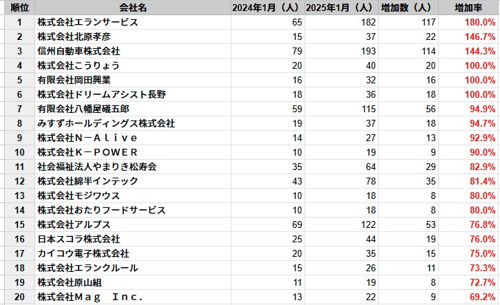 ・2024年1月時点と2025年1月時点の従業員数を比較