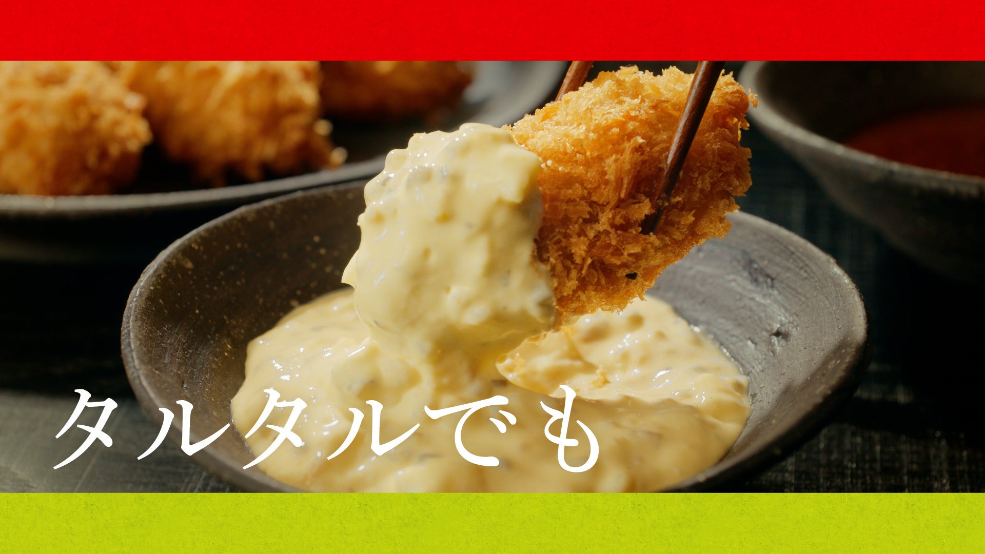 ・ストーリー:揚げたてでサクサクなかきフライと、味変を愉しめるタルタルソースやソースがテンポよく切り替わる映像と印象的な音楽で訴求しています。
