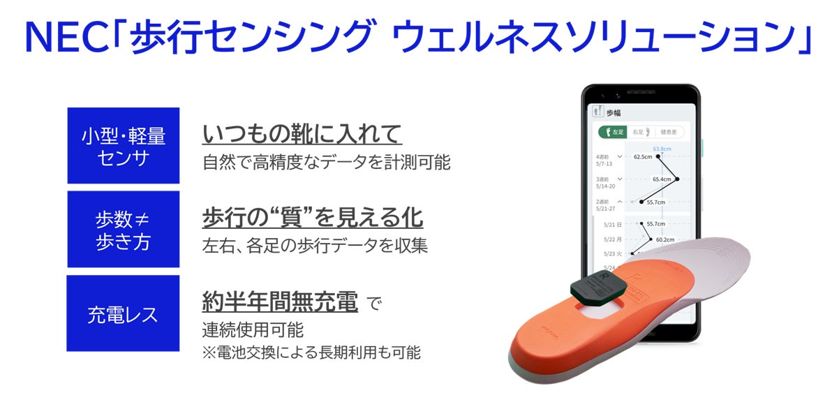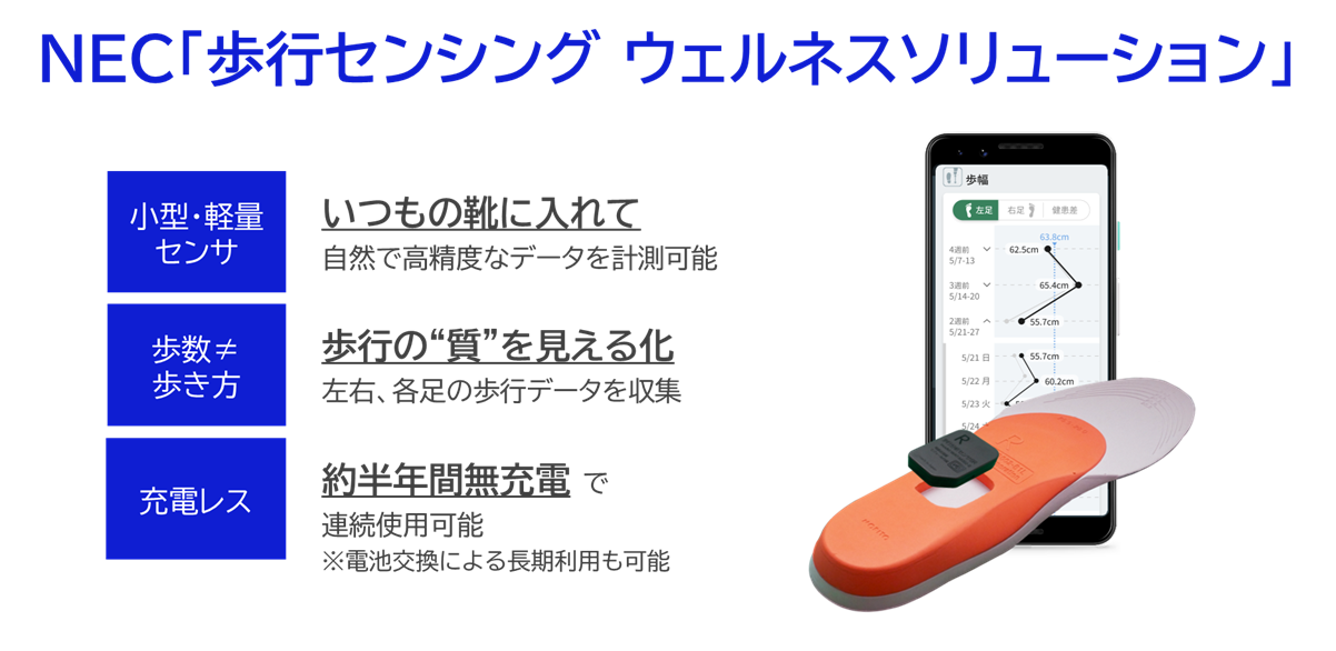 NECは、ヘルスケア・ライフサイエンス事業において、歩行の変化を捉えることで、日々のコンディションに気付き、行動のきっかけを得ることができる歩行センシング・ウェルネスソリューションを「あなたと気付き、ともに歩む、健康な日々。」というブランドステートメントのもと、様々な事業者様向けに提供しています。