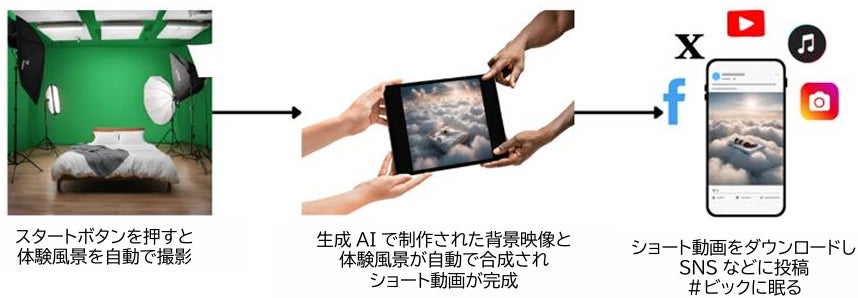 撮影用の特設ブースに寝具をはじめとする睡眠関連製品を設置し、お客さまが製品を利用しているシーンを高画質カメラにより自動で撮影します。自動撮影された動画と、その製品をテーマに生成AIで事前に作成した非日常の背景映像をその場で合成し、SNSなどに投稿できる15秒程度のショート動画をお客さまにプレゼントします。