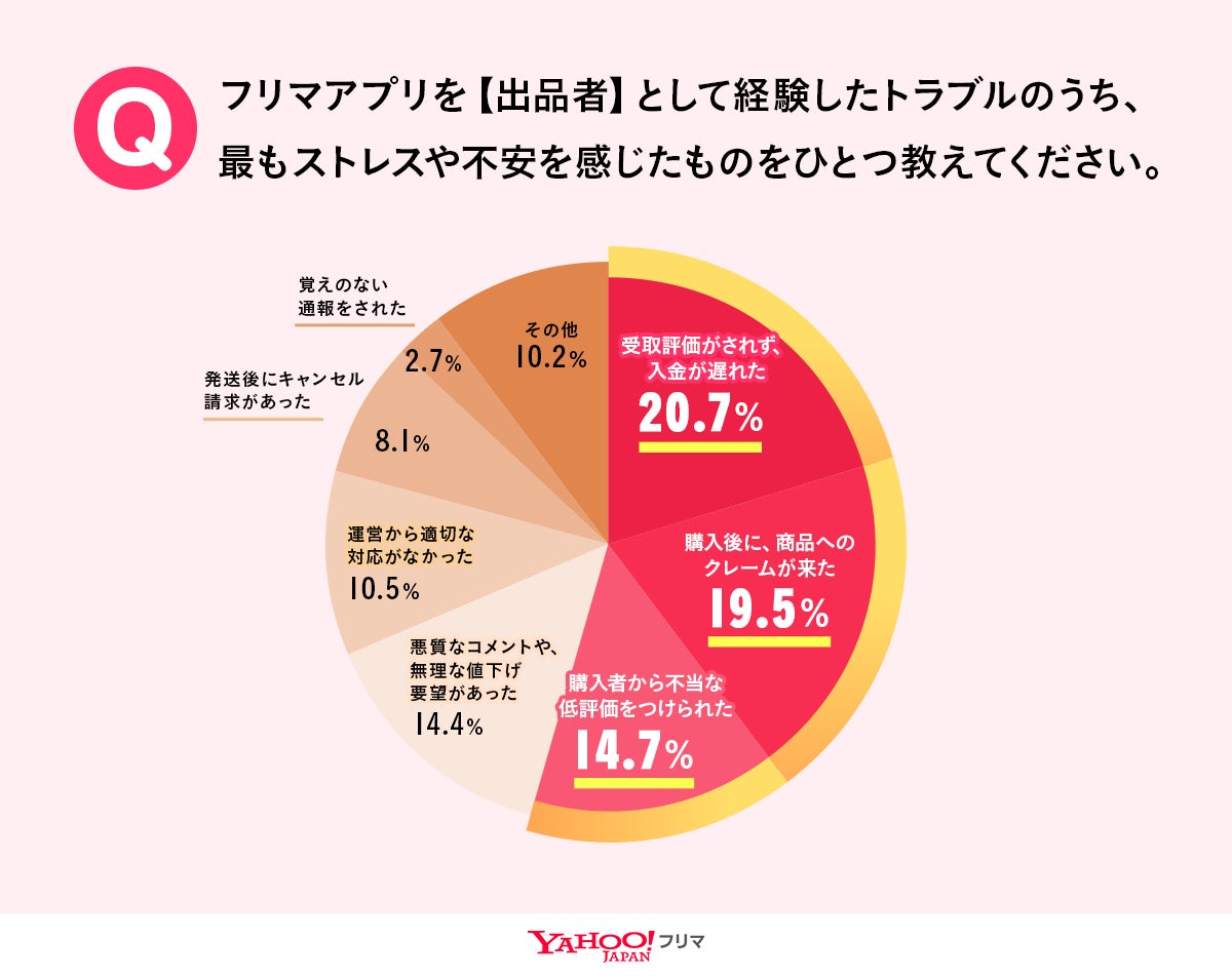 また、全体の31.6%がトラブルの経験が「ある」と回答し、経験したことのあるトラブルで最もストレスや不安を感じた内容は「受取評価がされず、入金が遅れた」が20.7%、次いで「購入後に、商品へのクレームが来た」が19.5%、「購入者から不当な低評価をつけられた」が14.7%となり、特に商品発送後のトラブルが多いことが明らかになりました。