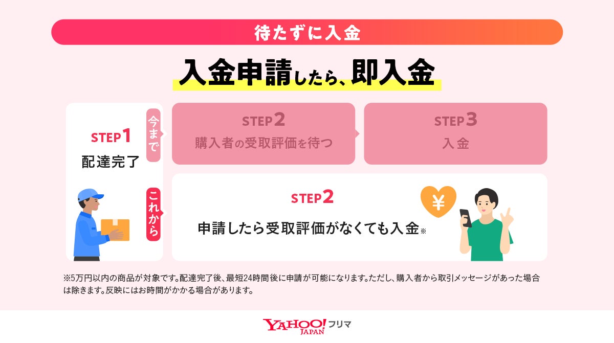 「ゴールド出品者」は、対象の取引(※2)について、商品の配達完了最短24時間後から入金申請でき、申請を行うと購入者の受取評価がない場合でも、売上金が即時に受け取れるようになります。