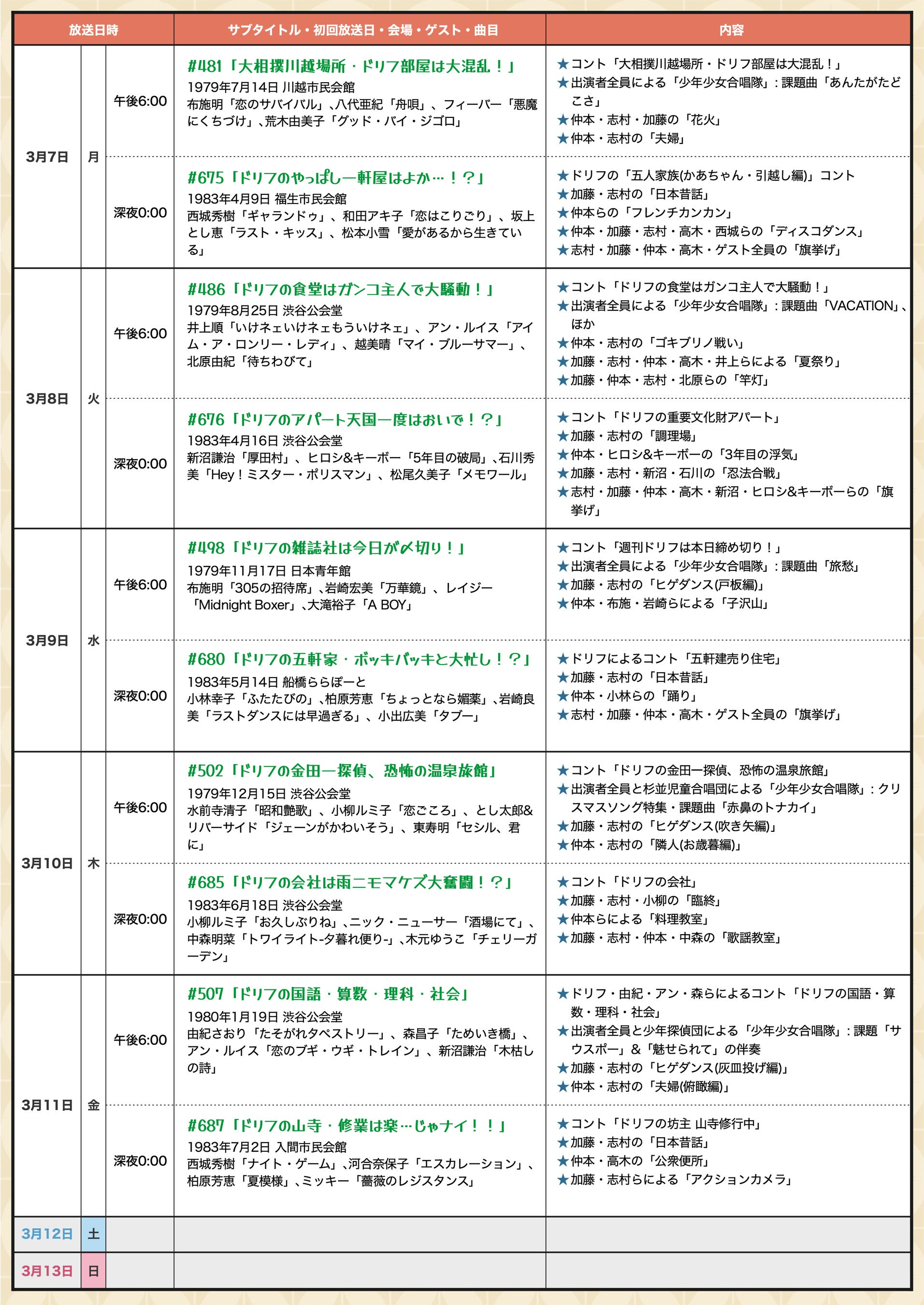 今回放送する計45エピソードのうち3分の2にあたる30エピソードがTBSチャンネル初登場となる。いずれのエピソードもオープニングからエンディングまで放送当時のままお届けする。当時、全国の子供たちがマネをしたギャグの数々。ヒゲダンスや早口言葉などの人気コーナー。そして、歌唱はもちろん時には体を張ってコントなどにも参加した実力派歌手や人気アイドルら豪華ゲストの面々。日本中に笑いを届け続けた、昭和のお笑いバラエティショーを心ゆくまで再体験できる絶好の機会をお見逃しなく。