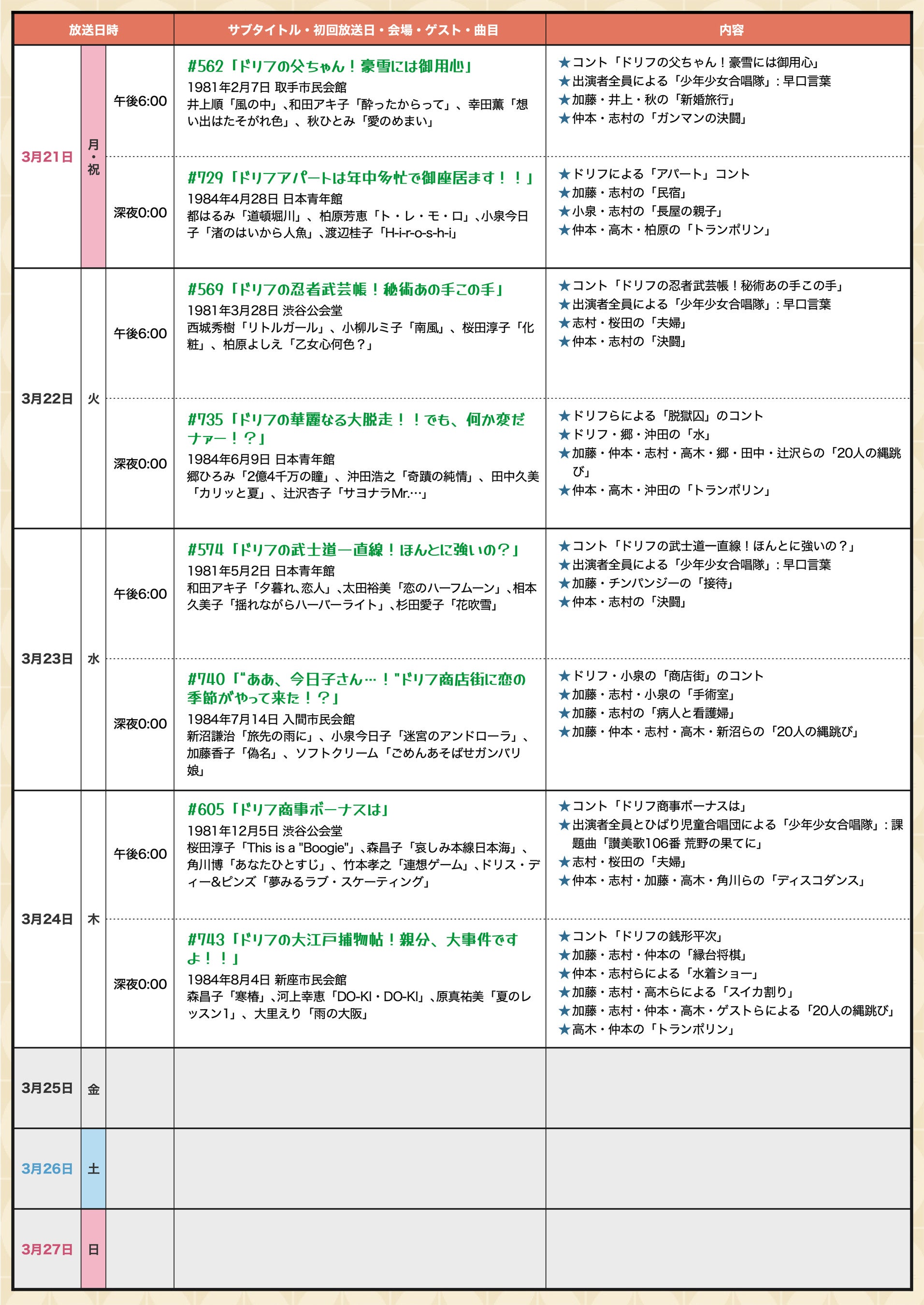 株式会社TBSテレビ(本社:東京都港区、代表取締役社長:佐々木卓)が運営するCS放送「TBSチャンネル2 名作ドラマ・スポーツ・アニメ」は、ザ・ドリフターズ(いかりや長介、仲本工事、志村けん、高木ブー、加藤茶)が出演した伝説のバラエティ番組『8時だョ!全員集合』全803回の中から厳選した45エピソードを、3月1日(火)から毎週(月)~(金)午後6時台および深夜0時台に蔵出し連日放送する(休止および別曜日の放送あり)。
