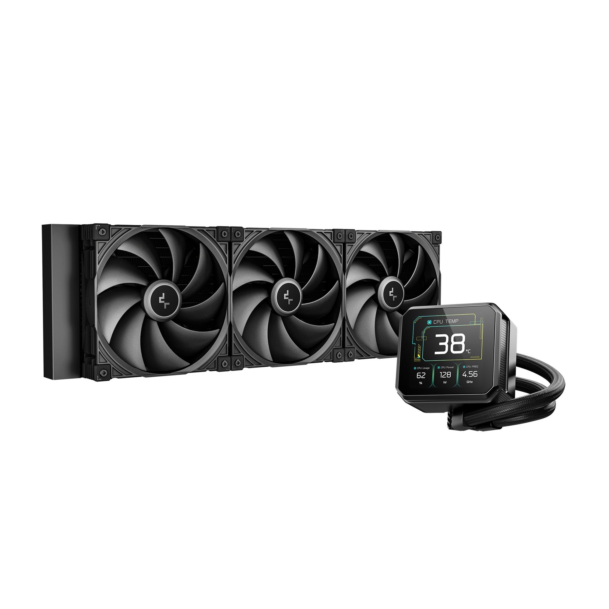 ポンプヘッドには854×480解像度の4.5型IPS LCDを搭載しており、CPUの温度や使用率などのステータスをリアルタイムで表示可能。表示内容は「DeepCreative:コントロールセンター」でカスタマイズできます。「D-Cast」機能により、PCのサブディスプレイとしても利用可能です。