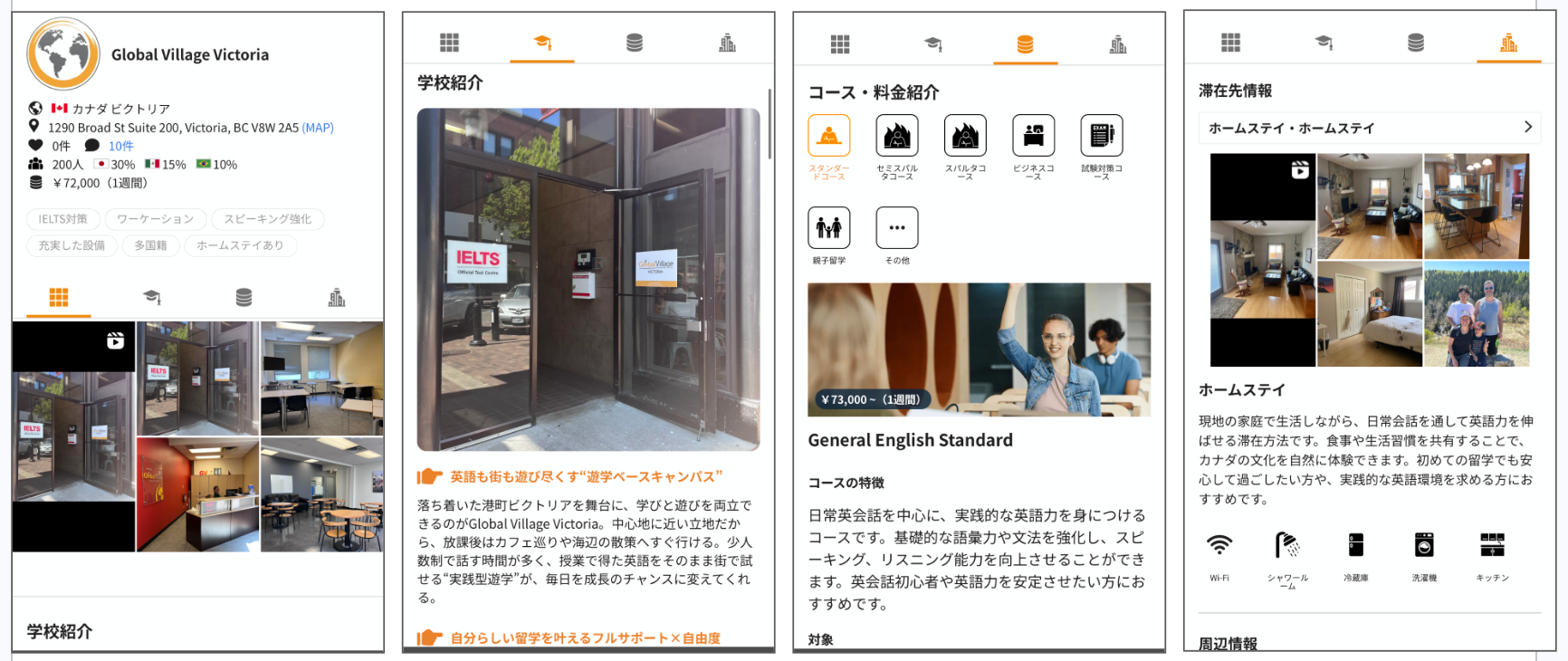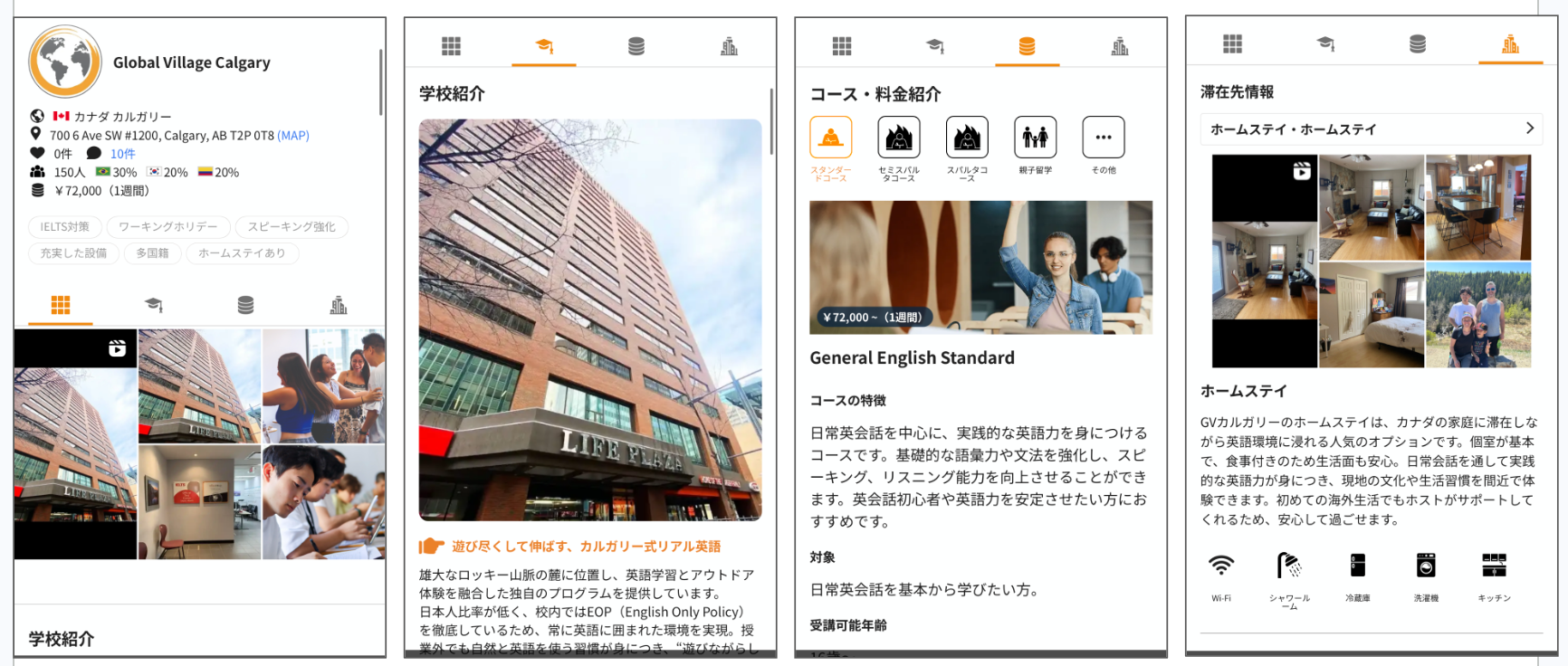 ネイティブキャンプ留学では、ユーザーが必要な情報を分かりやすく把握できるよう、常に丁寧で明確な情報提供を心がけています。Global Villageの詳細情報は、以下の4つのカテゴリーに分けて掲載しており、知りたい情報を的確にお届けします。