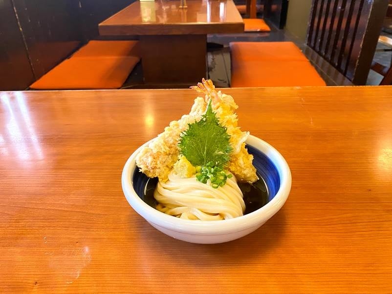 手打ちうどん職人森田真司さんの讃岐うどんは、空中に浮かしながら丁寧にのばす“空まわし”と呼ばれる技術で手打ちならではの食感を大切に。
