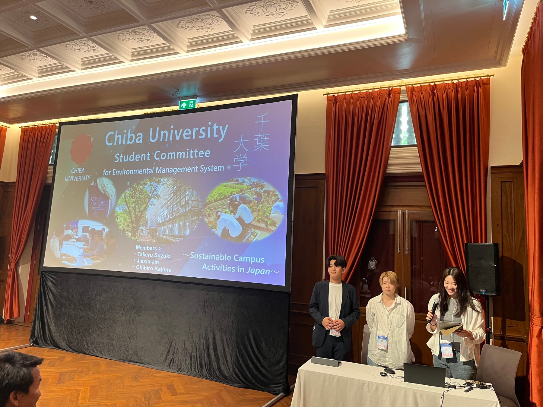 千葉大学からは環境ISO学生委員会の学生3名が参加しました。各国のネットワークの取り組み紹介や基調講演を傍聴し、その後、学生発表部門で10分の英語でのプレゼンテーションを行いました。