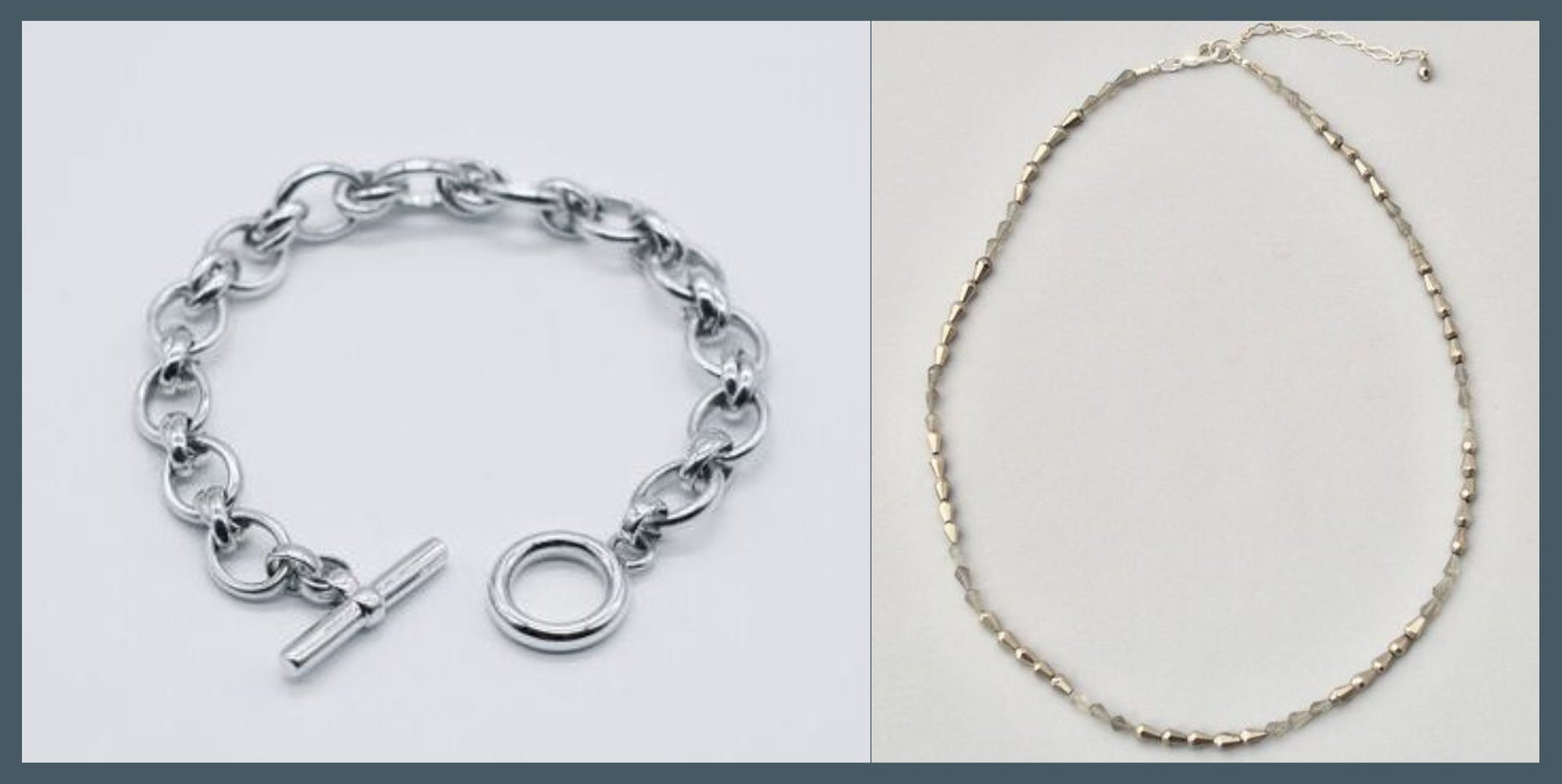 (左)夏に着けたい涼しげなシルバーのシンプルブレスレット。流行のマンテルの留め具がこなれ感を演出。
