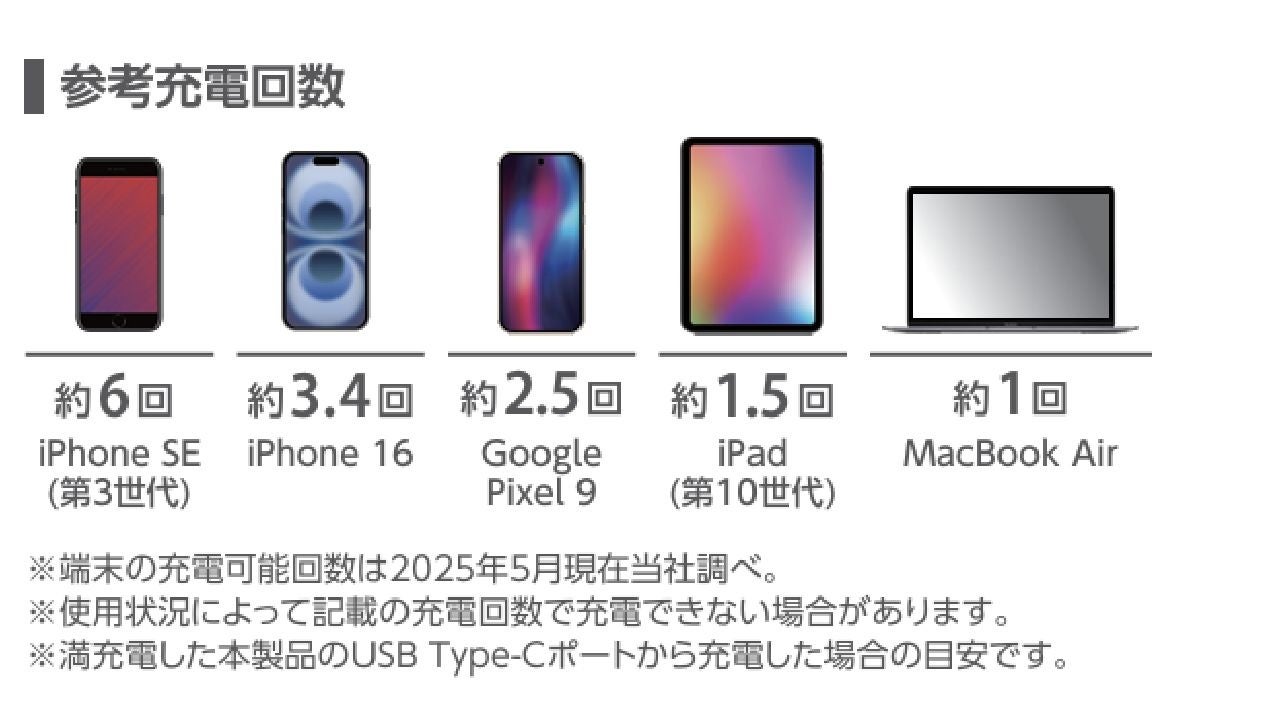 ※満充電した本製品で電源オフの状態のスマートフォンを充電する際の目安回数です。充電中に電源を入れたり、機器を使用したりする場合は記載の数値まで充電できない場合があります。
