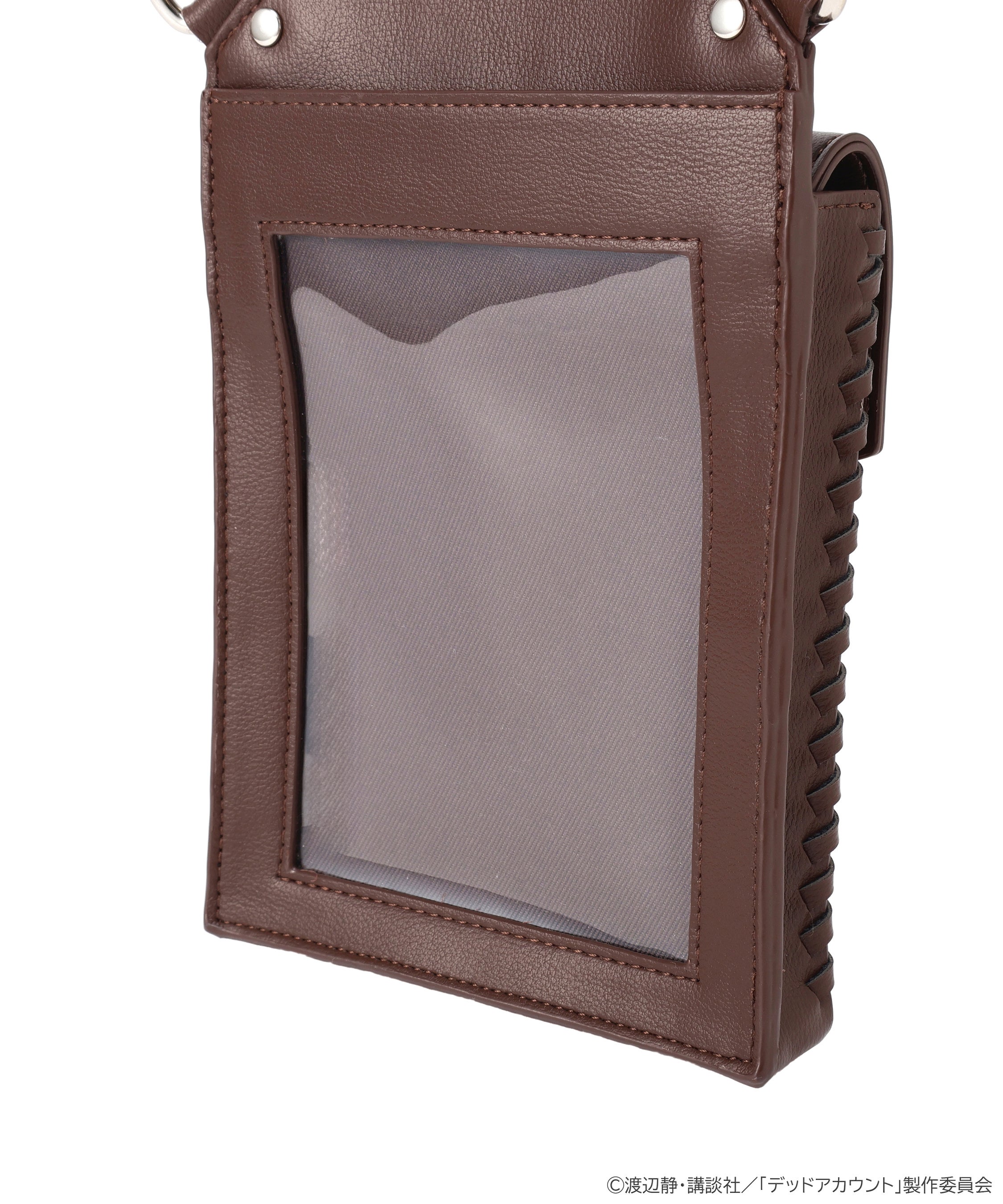 表面のポケットには弥電学園のマークを刺繍し、フチにはレースステッチを施しています。背面側は、ICカードやお気に入りのトレーディングカードなどを入れられるクリア仕様。