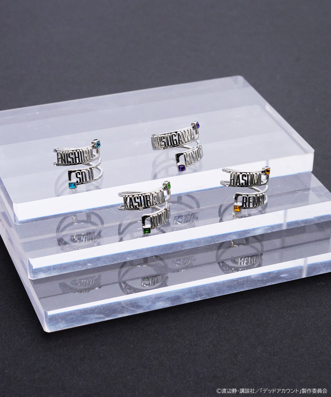 リングには、各キャラクターの名前をデザインし、“グリッチ”を表現したイメージカラーのラインストーンを採用。単体でもネックレスとしてもお楽しみいただける2way仕様です。