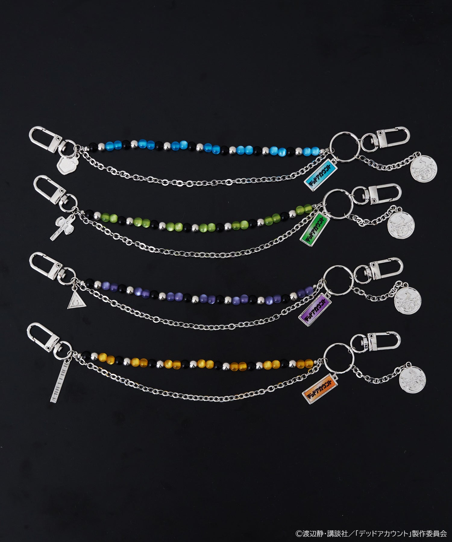 各キャラクターをイメージしたカラービーズとモチーフで構成されたバッグチャーム。