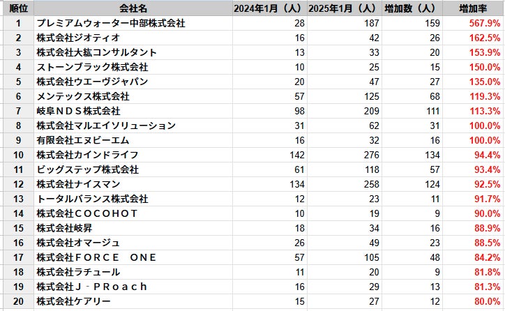 「誰もが活躍できる仕組みをつくる。」をミッションに掲げ、セールスチームの武器となるデータベース「SalesNow」を展開する株式会社SalesNow(本社:東京都渋谷区、代表取締役:村岡功規、以下「SalesNow」)は、国内550万社の企業情報を完全網羅した日本最大級のデータベース「SalesNow DB」より、岐阜県に本社を置く企業の2024年1月時点および2025年1月時点の従業員数データを分析し、従業員数増加率ランキングTOP20を発表しました。本ランキングは、各企業の成長スピードを可視化するものであり、新規雇用の創出や事業拡大の動向を明らかにしています。