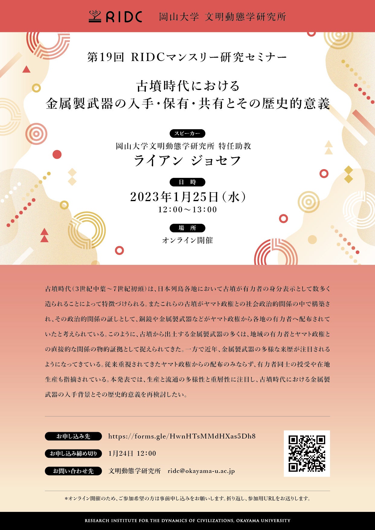 【岡山大学】文明動態学研究所「古墳時代における金属製武器の入手・保有・共有とその歴史的意義」〔1/25水, オンライン〕