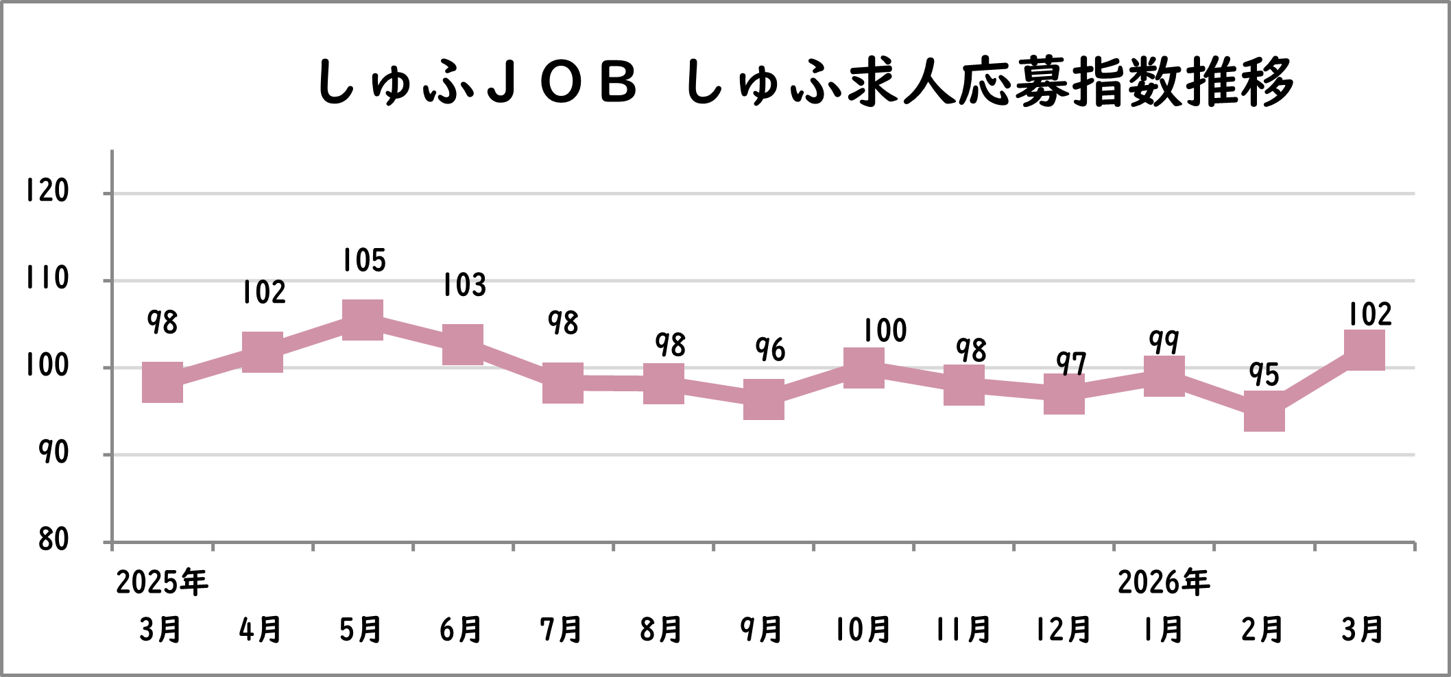 【しゅふの就職意欲調査 2026年3月】しゅふ求人の応募指数102(前月比+7)