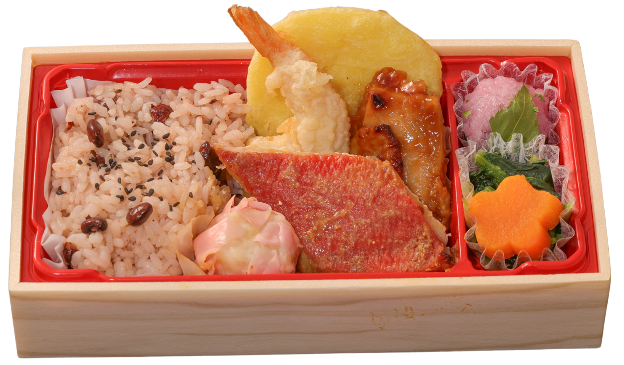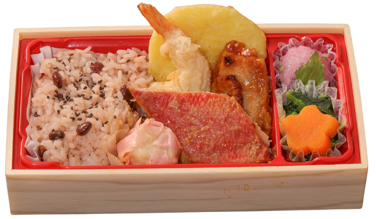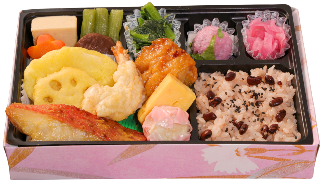 「大」1,850円(税込)=天ぷら(えび、れんこん、さつまいも)/金目鯛西京焼き/煮物(花形人参、椎茸、高野豆腐、ふき)/チキン照り焼き/竹の子焼売 /厚焼玉子/小松菜※木の芽和え/赤飯(160g)/香の物/ミニ桜餅
