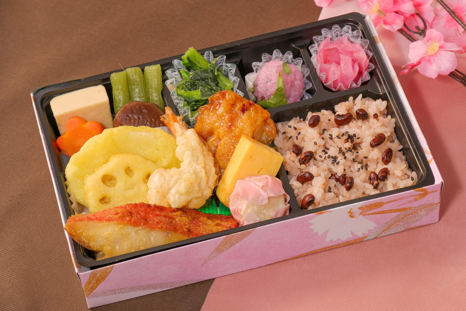 お花見御膳は赤飯や天ぷらを中心に、金目鯛の西京焼き、煮物など、見た目も華やかに詰め合わせます。たけのこを使ったシューマイや桜餅といった春らしいメニューも楽しめます。