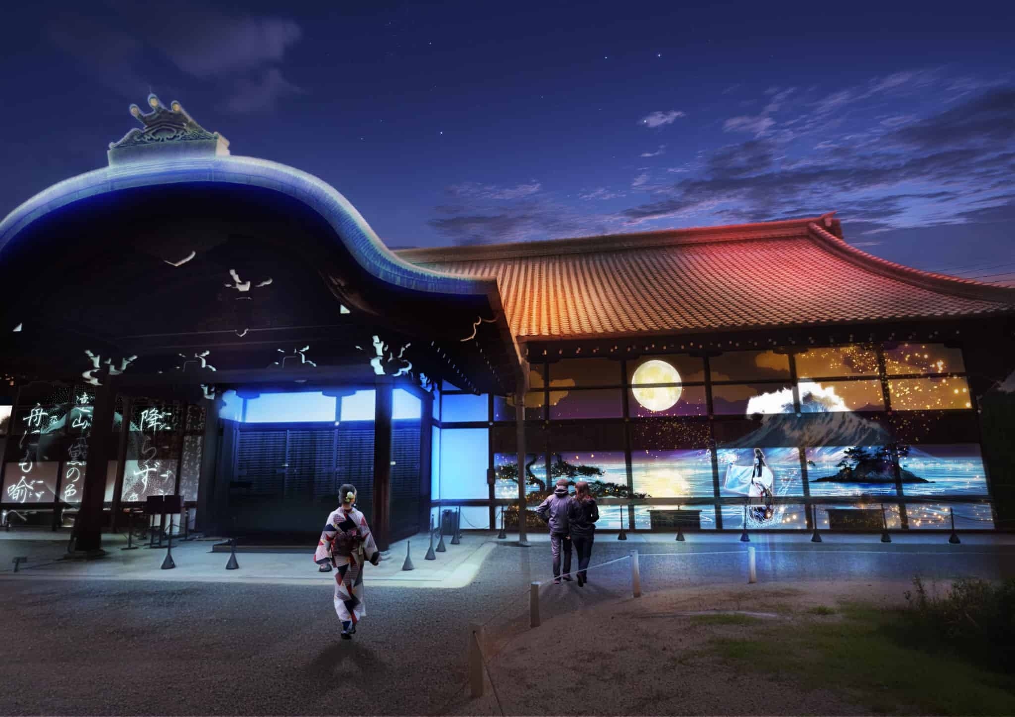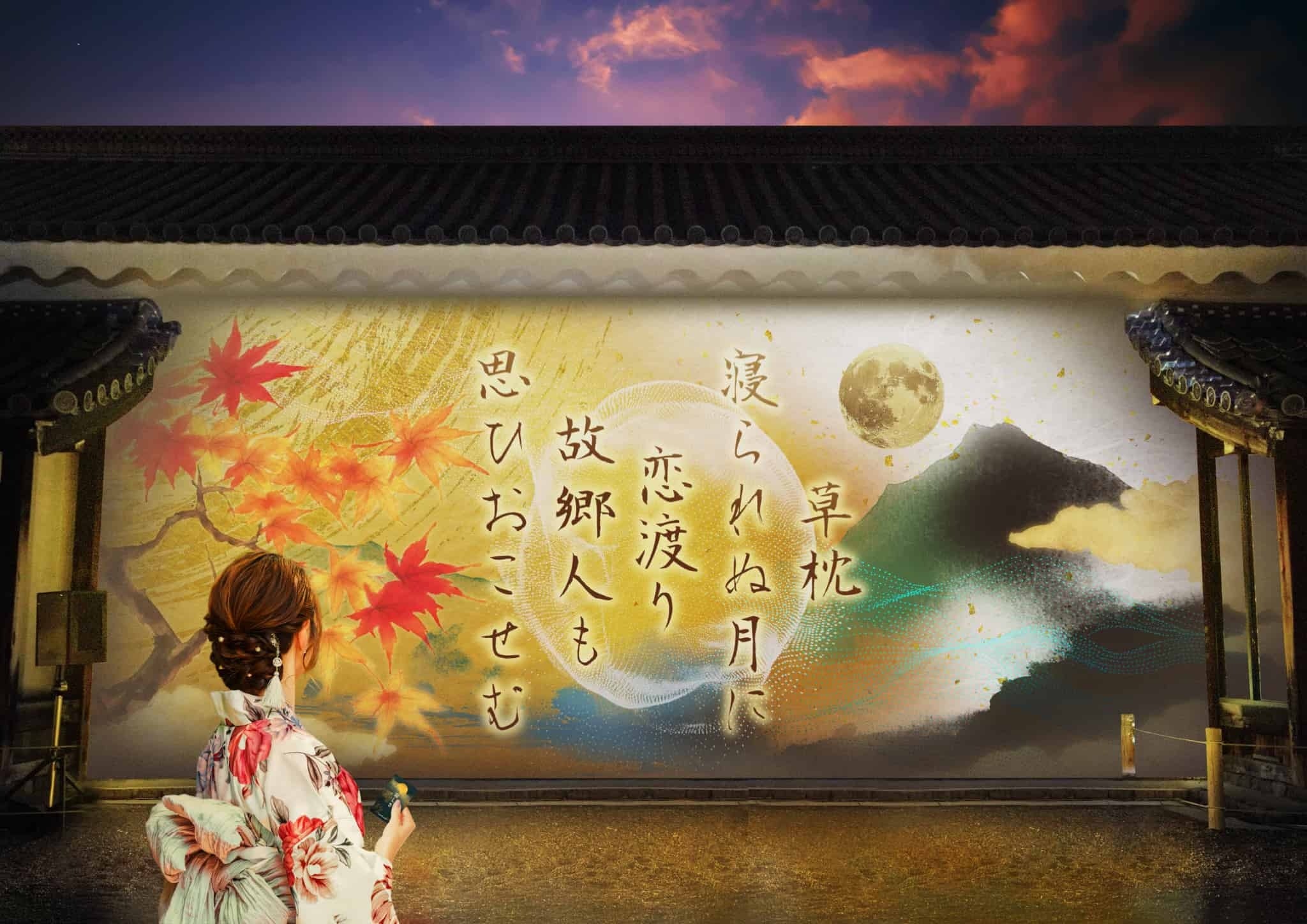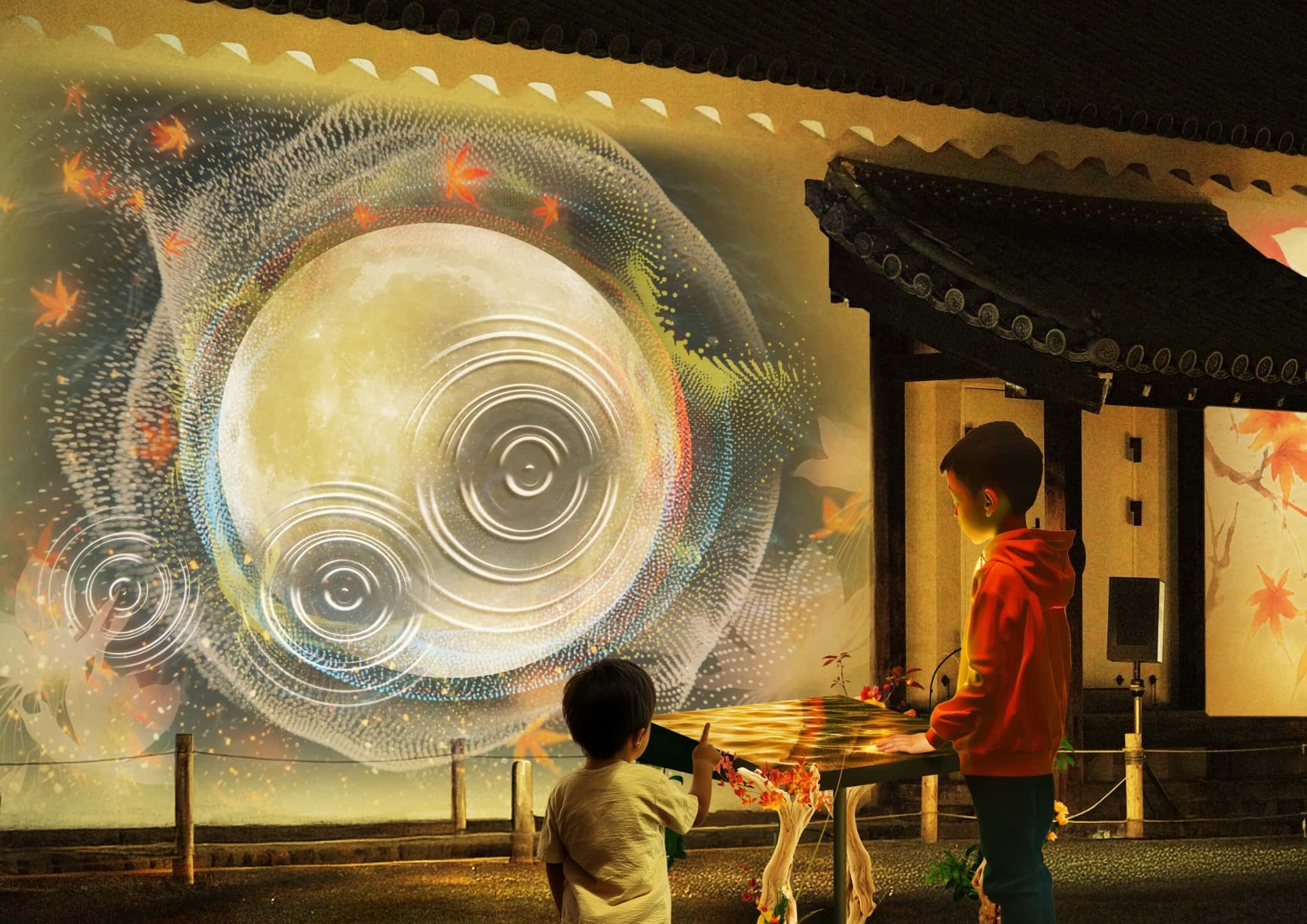 平安時代の美意識を現代に伝える試みとして、京都府立嵯峨野高等学校 京・平安文化論ラボの生徒たちが「月」や「秋」をテーマにした和歌26首を選定。後水尾天皇ゆかりの歌などを中心に構成され、平安文学研究者・京都先端科学大学 山本淳子教授が監修を担当します。来場者は、光と音に包まれた空間で和歌を鑑賞し、平安の情緒と現代のアートが響き合うひとときを体験できます。
