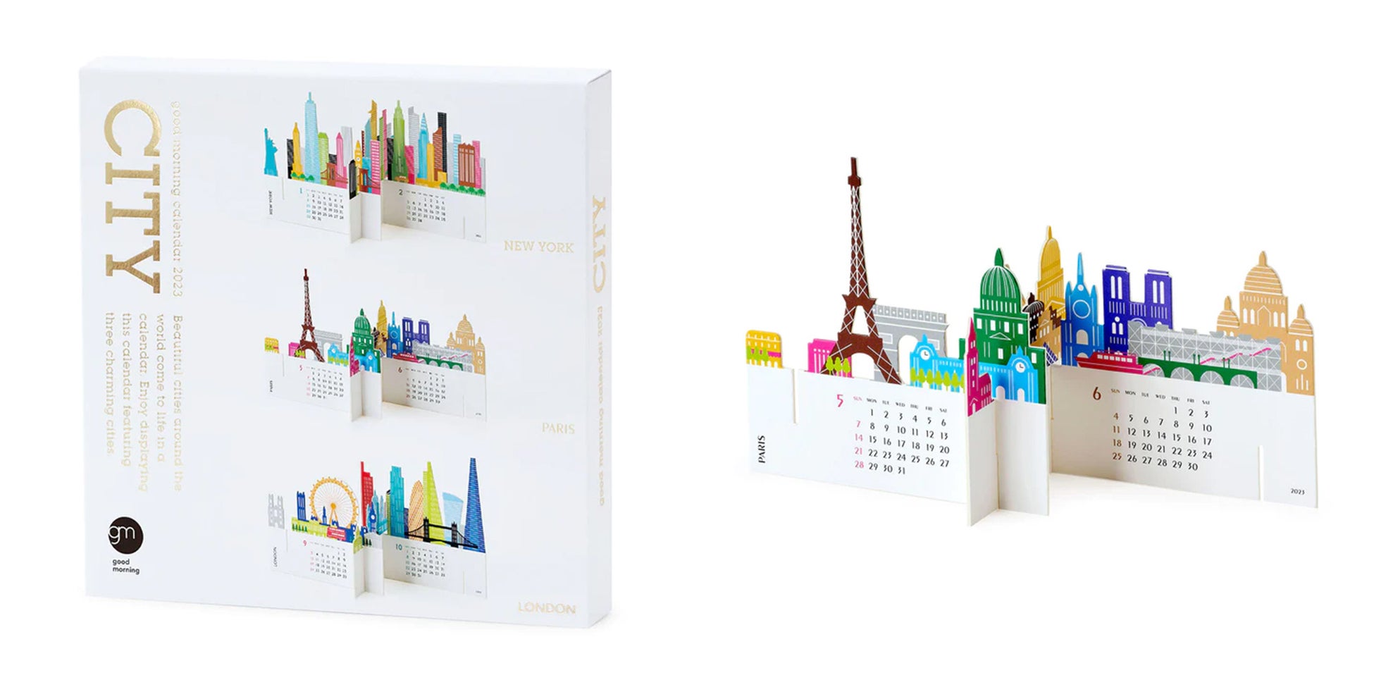 CITYは、世界の都市をモチーフにしたカレンダーです。パーツを組み立てると、ランドマークが立ち並ぶカラフルな都市が完成します。