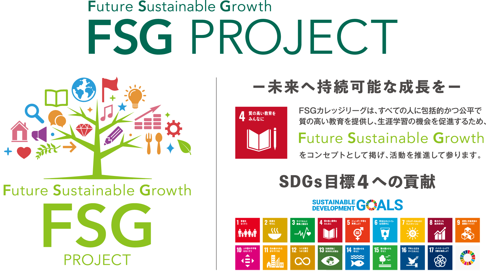 昨年度よりFSGカレッジリーグではFSGパートナーズ各社と連携・協力し、SDGs活動の目標4「質の高い教育をみんなに」への貢献を目的に、すべての人に包括的かつ公平で質の高い教育の提供と、生涯学習の機会を促進するため、「Future Sustainable Growth」(未来へ持続な成長を)をコンセプトに掲げ、『FSG PROJECT』(エフエスジープロジェクト)の活動を推進しております。