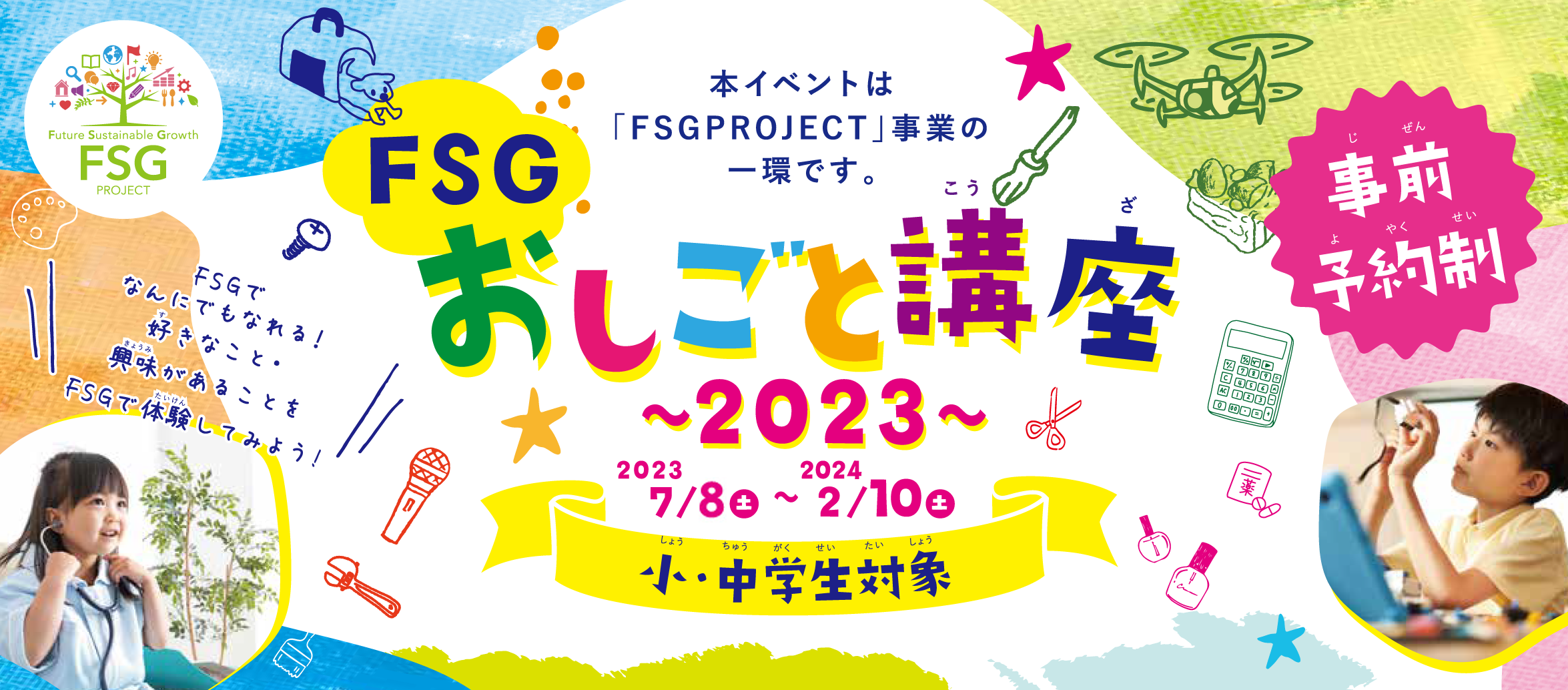 今回「FSG PROJECT」の一環として、2023年7月から2024年2月までの期間、小・中学生を対象とした「FSGおしごと講座2023」(約90講座)を昨年に引き続き開催いたします。