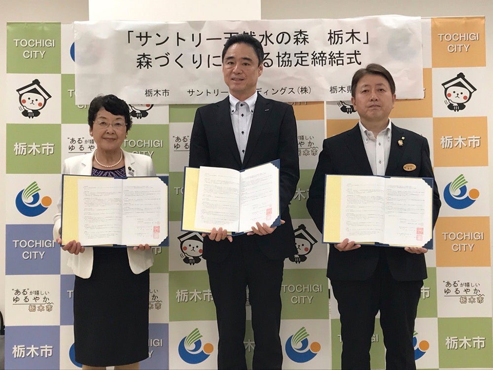 サントリーホールディングス(株)は、水源涵養力と生物多様性の向上を目的とした森林整備活動「サントリー 天然水の森」をさらに拡大するため、栃木県および栃木市と、「サントリー 天然水の森 栃木」の森林整備に関する協定を7月8日(月)に締結しました。栃木県における「サントリー 天然水の森」に関する協定締結は「同 日光霧降」に続き2カ所目となります。