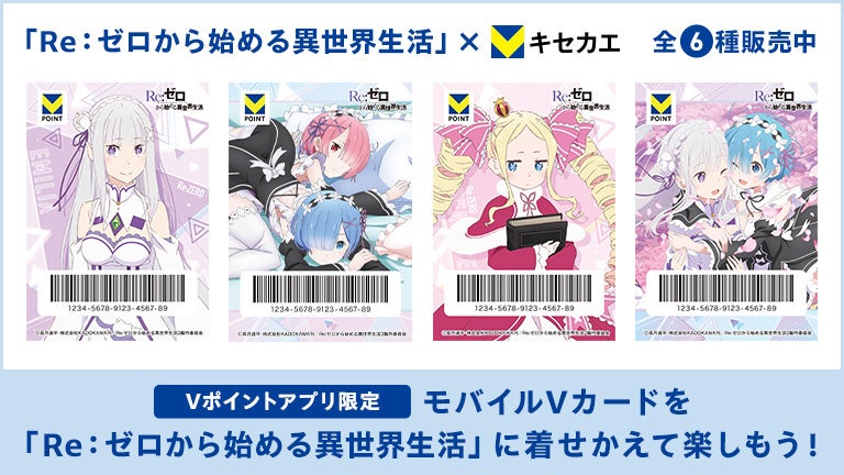 CCCMKホールディングス株式会社(本社:東京都渋谷区、代表取締役社長兼CEO:髙橋誉則)は、Vポイントアプリの「モバイルVカード」を好きなデザインに着せかえできる「Vキセカエ」(https://ip.tsite.jp/guide)において、『Re:ゼロから始める異世界生活』より、メインキャラクターを中心としたデザイン全6種を、2025年4月2日(水)から2026年4月1日(水)まで期間限定で販売いたします。