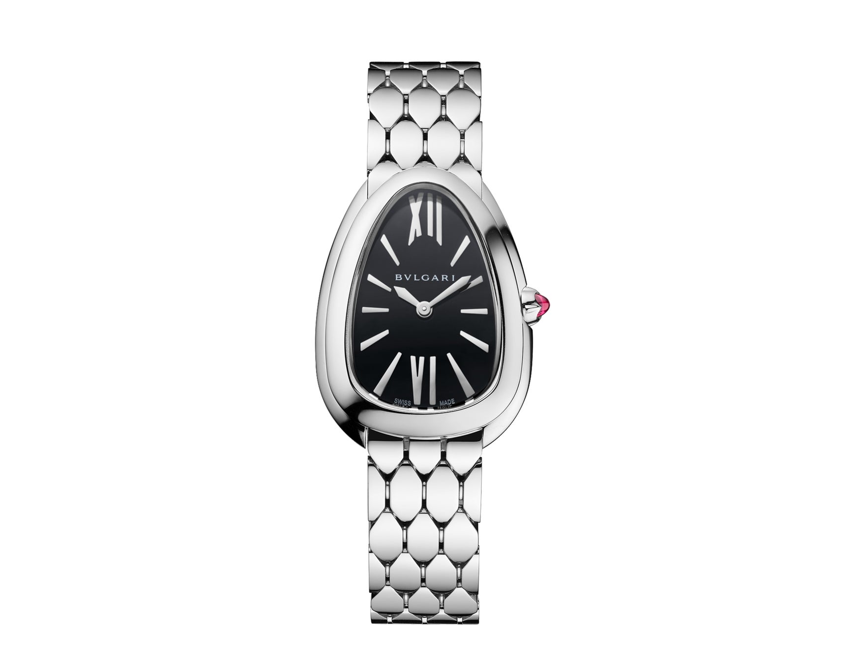 2019年に誕生の「セルペンティ セドゥットーリ」は、「セルペンティ トゥボガス」に着想を得たタイムピース。イタリア語で蛇を意味する「セルペンティ」は創業以来、ブルガリの想像力をかき立て大胆なデザインを生み出してきました。生命力と再生の象徴である神秘的な蛇が、「セルペンティ セドゥットーリ」ではセンシュアルな魅力をたたえながらフェミニンな輝きを放っています。1960年代の “シークレット”セルペンティ ウォッチにインスパイアされ、蛇の頭を模した独自の曲線美を持つシグネチャーケースに第二の皮膚のような着け心地の六角形のスカリエ(鱗)ブレスレットが、見事なまでに一体化しています。熟練の技術により繊細に作られたブレスレットは、幾何学的エレメントが美しく連なるセンシュアルなデザインです。「セルペンティ セドゥットーリ」は、スイスのブルガリ時計工房のノウハウにより命を吹き込まれ、ウォッチの素材やジェムがその魅力をさらに高め時間を限りなく貴重な瞬間の流れに変えてくれるのです。