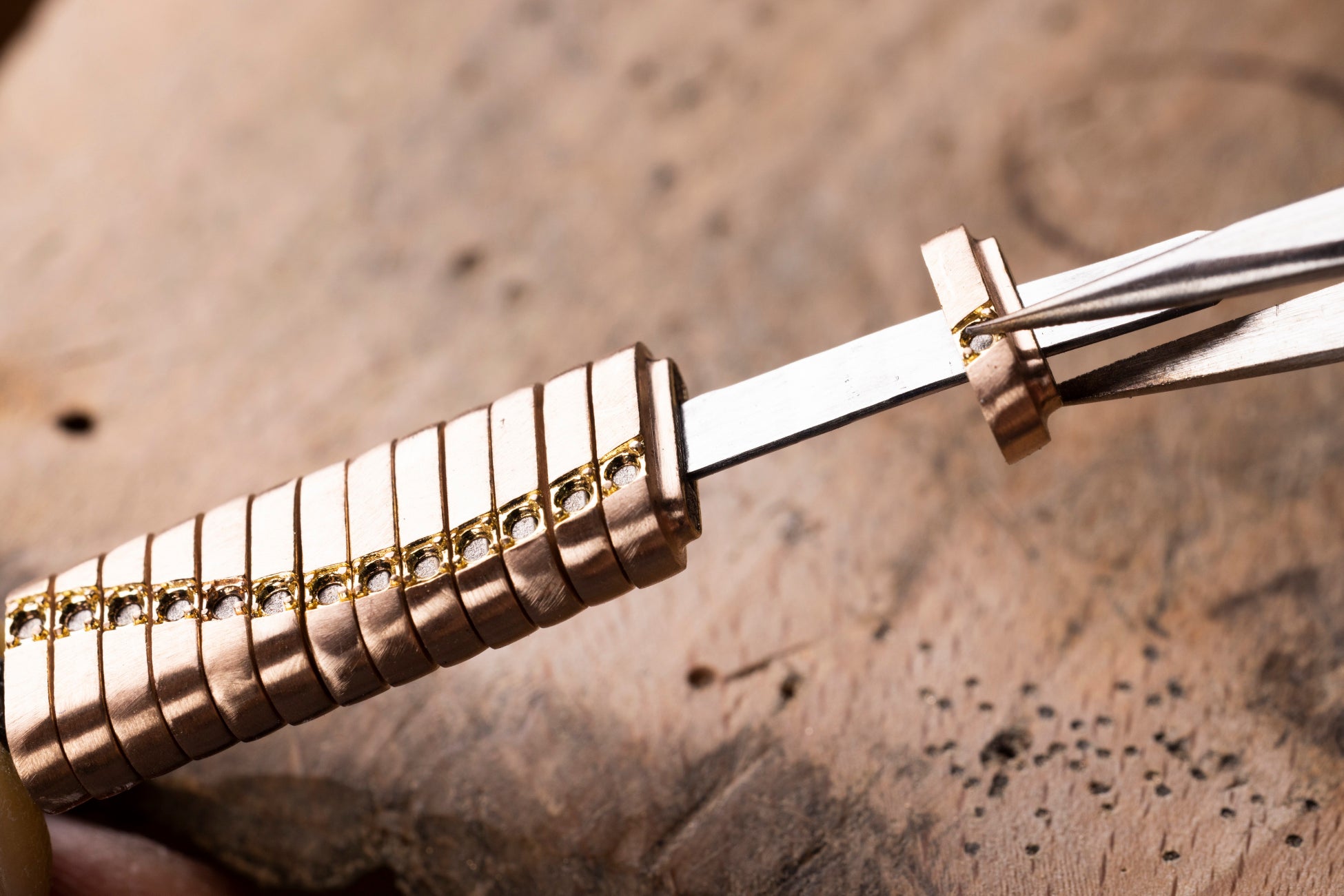 ケース/ダイヤル:径35mm、8石のダイヤモンド、44石のダイヤモンド、ブリリアンカットダイヤモンドを施したピンクゴールド製ケース、262石のパヴェダイヤモンドを施したダイヤル、ピンクゴールド製リューズにカボションカットのルベライトをセッティング