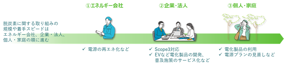 今後は「エネルギーを利用する企業・法人」「個人・家庭」のセグメントに対し、「行動変容を促すしくみ」のソリューションを具体化させていきます。具体的には、既に実証実験として取り組んでいるEVソリューション、節電ソリューション、環境価値取引、SCOPE3対応などのサービス提供を目指します。