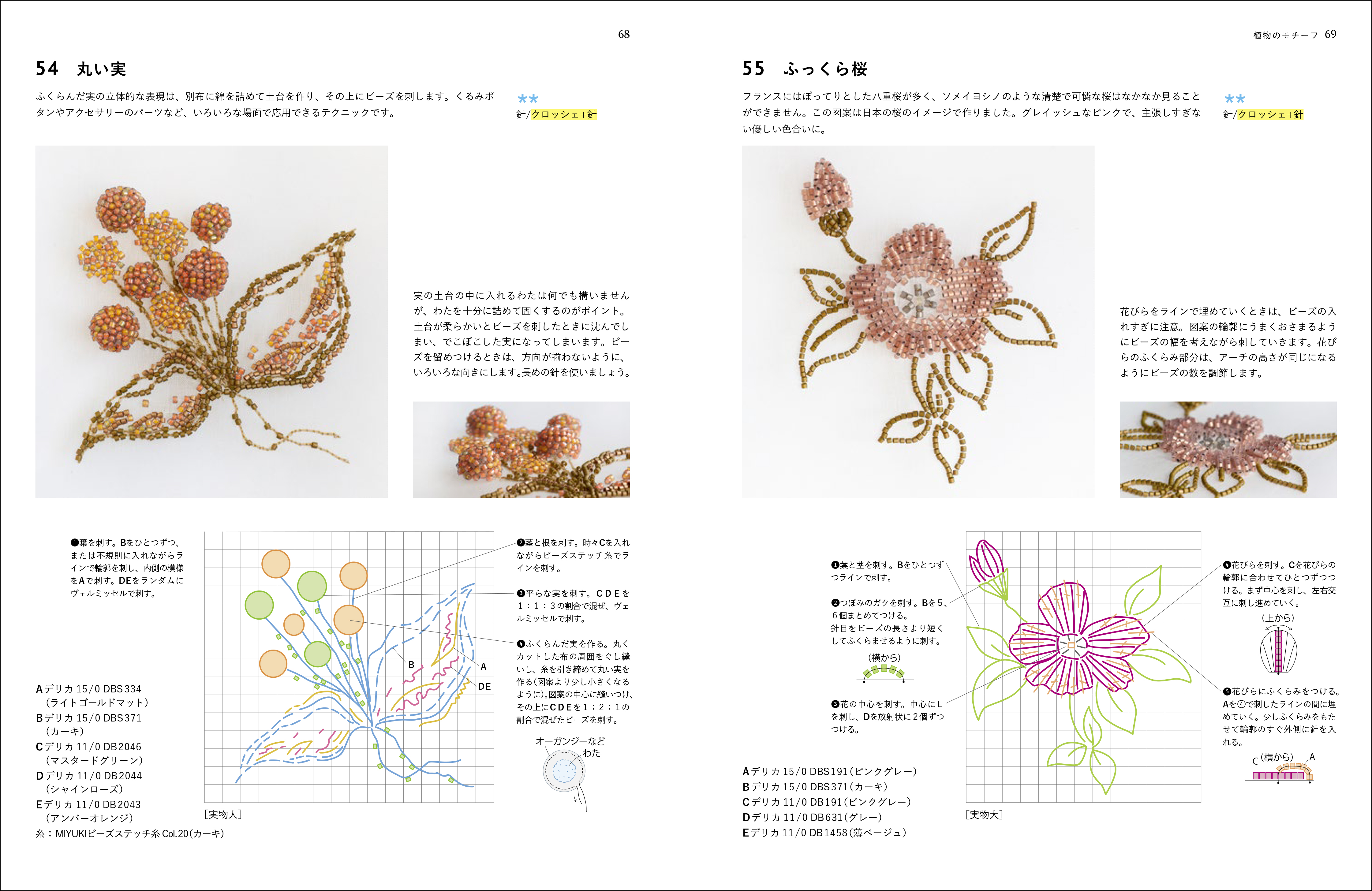 本書は手に入りやすいシードビーズを中心に、植物や花のモチーフ、レースやガロン(ブレード)など118の図案を紹介します。