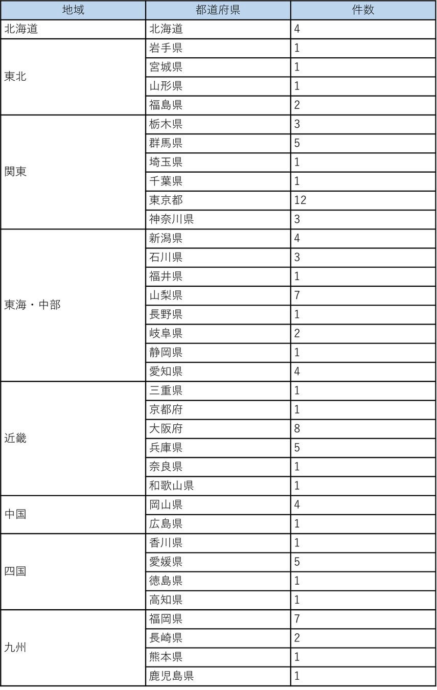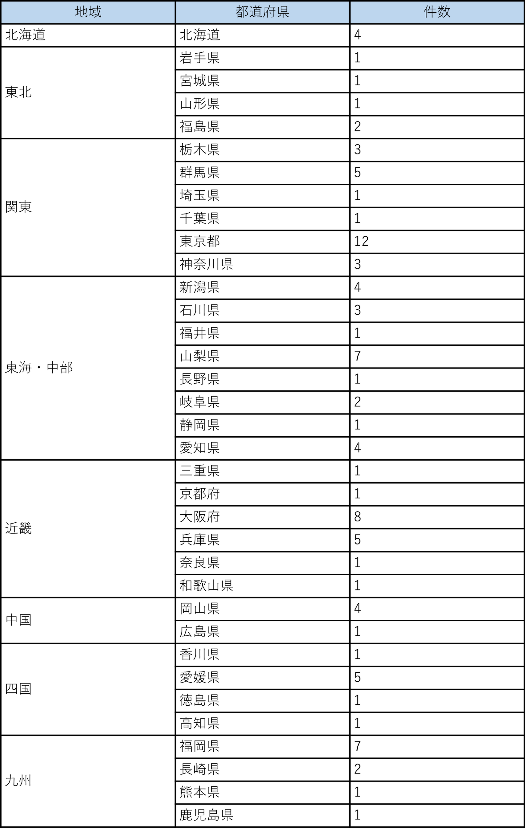 ・都道府県別で参加企業数の多い自治体は、最多の東京都(12社)に続き、大阪府(8社)、福岡県(7社)、山梨県(7社)、群馬県(5社)、兵庫県(5社)、愛媛県(5社)、北海道(4社)、新潟県(4社)、愛知県(4社)、岡山県(4社)。