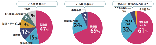 ・業種別では製造業が47%を占め、求人職種についても技術職が69%と、専門人材を求める傾向が顕著。
