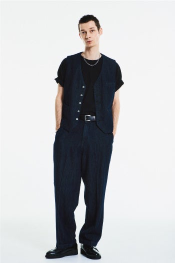 また、メンズラインはベーシックなジャケットに加え、ゆったりとしたルーズストレートや定番のベーシックストレートなどをメインに展開。程よいゆとりある腰回りと、まっすぐ落ちるレッグラインなデザインを中心としたセットアップでも可能なラインナップで充実している。メンズアイテムにおいても一部インチサイズ展開へと変更しています。