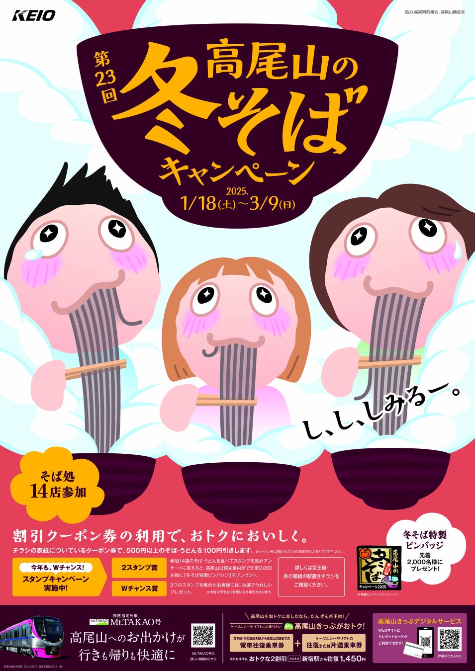 京王電鉄株式会社(本社:東京都多摩市、取締役社長:都村 智史)と高尾山の冬そばキャンペーン実行委員会(会長:佐藤 知巳)は、1月18日(土)から3月9日(日)まで、「第23回高尾山の冬そばキャンペーン」を実施します。京王線・井の頭線各駅で配布しているチラシにスタンプを集めて「高尾山口観光案内所」にお持ちいただくと、先着2,000名様にオリジナルピンバッジを進呈します。