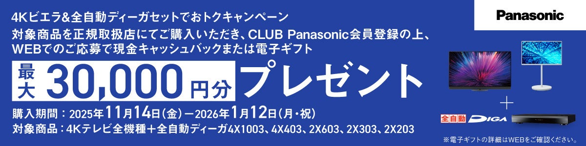 パナソニック株式会社は、期間中に対象のパナソニック製4Kテレビ・全自動ディーガをご購入、CLUB Panasonic会員登録の上、WEBからご応募いただいた方を対象に、お得なキャッシュバックキャンペーンを2025年11月14日より実施します。