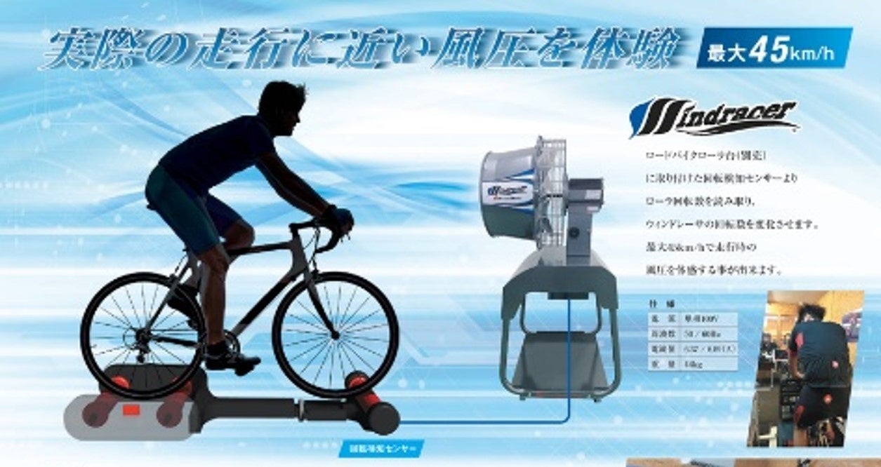 最大45km/hの風を受けながらサイクルトレーニングをおこなうことができます。 ロードバイクローラ台と組み合わせることで回転数検知をおこない、スピードに合わせた風を感じながらトレーニングをすることができます。