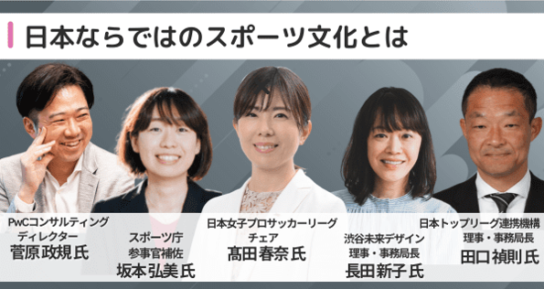 WEリーグ高田チェア、スポーツ庁坂本参事官補佐などが日本ならではのスポーツとの向き合い方、スポーツは今後どのように発展していくべきなのかを探る。